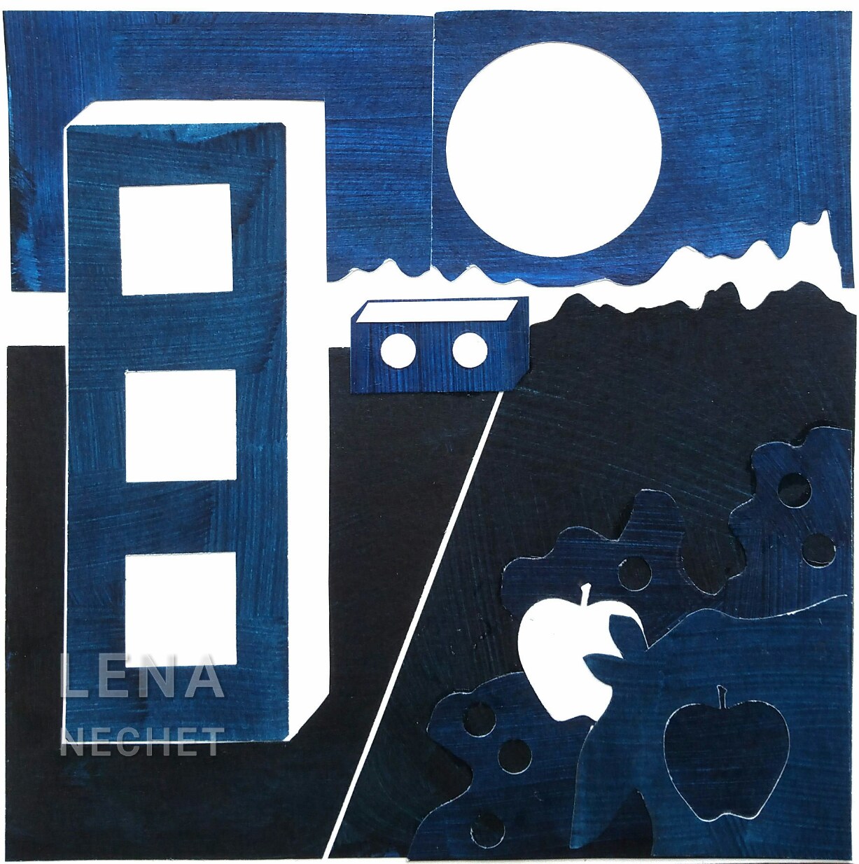 This collage demonstrates six color shades of blue blue. The emphasis, an art design principle, is made with negative shapes (white background), an element of art design: space - the dark value of blue contrasts with the lightest value. The rectangular shapes in perspective illustrate proportion, another art design principle.