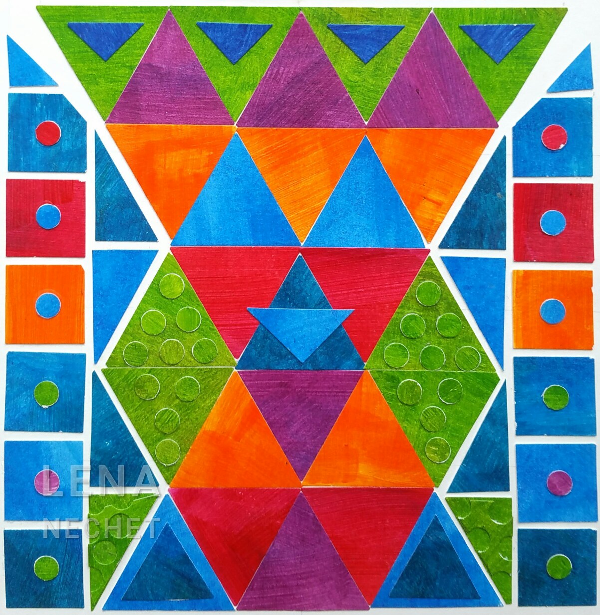 This collage in six tertiary colors demonstrates an art design elementtexture, including a pattern. Some pattern is created by contrasting violet and green or orange and blue triangles on the schematic vase and with circles on squares in the background. Some texture is created with the same hue by positive and negative shades (in green), using a low contrast (a design principle) created by change of brushstroke direction and by the white of the cut visually - visual texture, and by paper edges casting slight shadow - tactile texture - in a collage you can feel it as a relief.