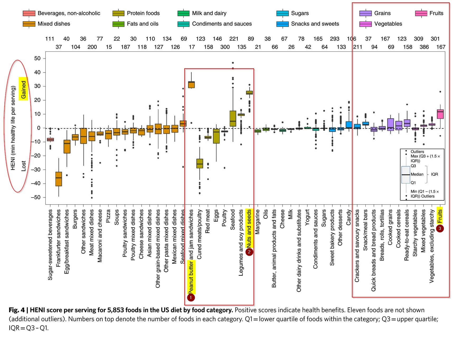 ...We developed the Health Nutritional Index to quantify marginal health effects in minutes of healthy life gained or lost of 5,853 foods in the US diet, ranging from 74 min lost to 80 min gained per serving. Environmental impacts showed large variations and were found to be correlated with global warming, except those related to water use. Our analysis also indicated that substituting only 10% of daily caloric intake from beef and processed meat for fruits, vegetables, nuts, legumes and selected seafood could offer substantial health improvements of 48 min gained per person per day and a 33% reduction in dietary carbon footprint.